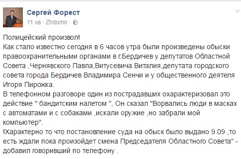 Сергей Форест сообщает, что в депутатов облсовета и городского совета г. Бердичева проводят обыски.