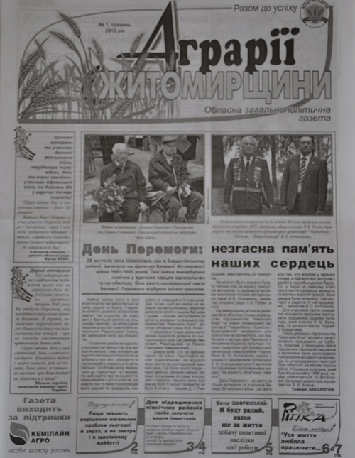 газети «Аграрії Житомирщини», засновником якої є Житомирська обласна партійна організація Аграрної партії України.