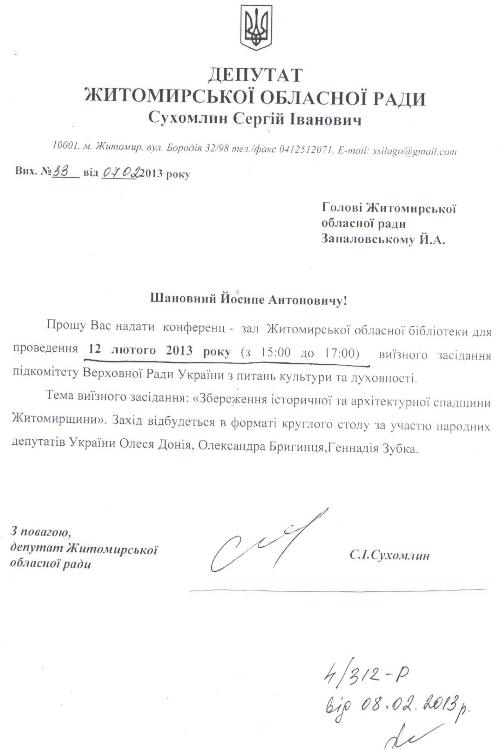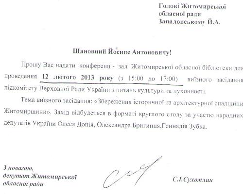 Сергій Сухомлин просить надати конференц-зал Житомирської обласної бібліотеки для проведення