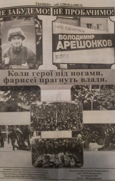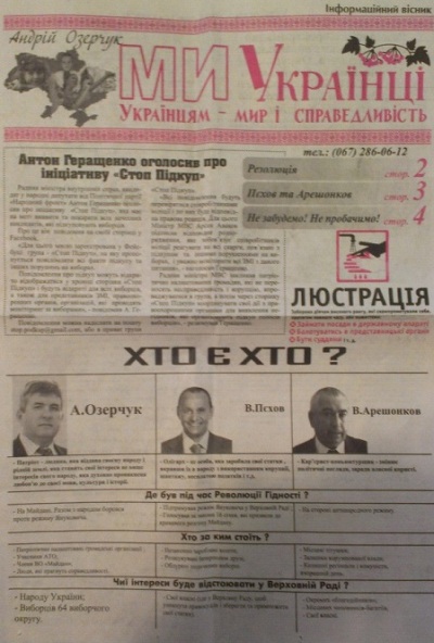 Газета, яку розповсюджує кандидат у народні депутати по 64-му виборчому окрузі Андрій Озерчук. Так і є. У вихідних даних – замовник Андрій Озерчук. Відповідальний за випуск - вірний друг і соратник Андрія Озерчука Іван Камінський. Нині він працює головним лікарем Коростенської ЦРП та є членом президії Коростенської районної ради.