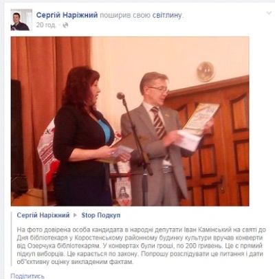 На фото - довірена особа і соратник Андрія Озерчука Іван Камінський 29 вересня, тобто на той момент, коли Озерчук вже був зареєстрований кандидатом у народні депутати, під час відзначення Дня бібліотек у Коростенському районному будинку культури роздає бібліотекарям подяки від кандидата в народні депутати і конверти з грошима. І що це, як не прямий підкуп виборців, за який світить від 2 до 5-ти? І що це, як не прямий привід кричати про пряме порушення виборчого законодавства і закликати на допомогу радника міністра внутрішніх справ Антона Геращенка, який між іншим теж балотується від «Народного фронту»? Тут я лише можу подякувати Озерчуку і Камінському за те, що опублікували у своїй газеті, куди я можу звернутися з цими фотографіями.