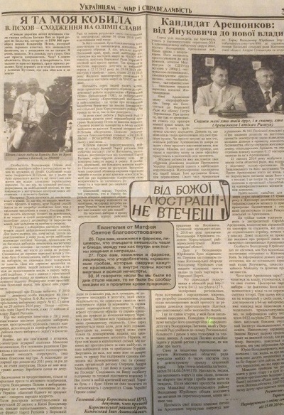 Третя шпальта газети Андрія Озерчука присвячена його головним конкурентам на цьогорічних позачергових виборах – Володимиру Пехову і Володимиру Арешонкову. Про них окремі статті. Про Володимира Пехова написав особисто лікар Іван Камінський. Статтю про Володимира Арешонкова передрукували з сайту «Цензор.нет». Я зайшов за цим посиланням на сайт «Цензор.нет». Там дійсно є подібний текст, але російською мовою і в значно скороченому вигляді. Тобто, цього тексту на сайті, на якій посилаються у газеті, немає. Питання до відповідального за вихід газети Івана Камінського: самі дописували чи хтось допоміг?