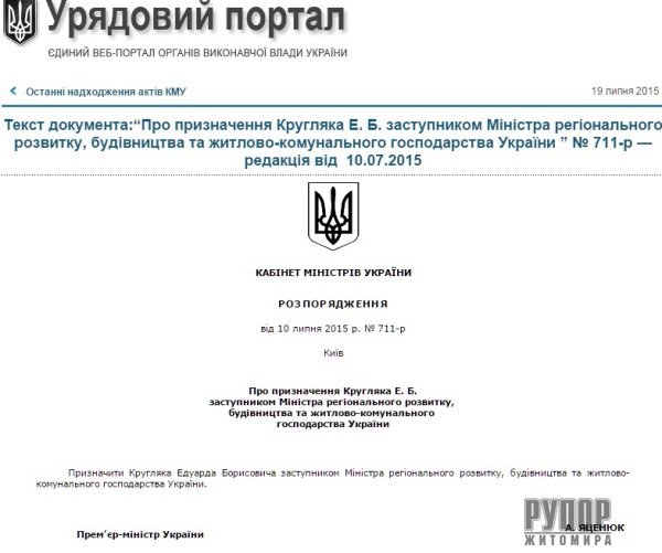 Рупор Житомира, відповідне Розпорядження від 10.07.2015 № 711-р з'явилося на урядовому сайті.