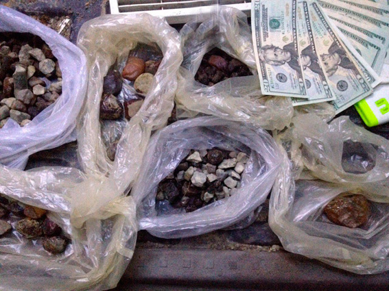 При осмотре автомобиля в салоне правоохранители обнаружили 5 полиэтиленовых пакетов с камнями, внешне похожим на янтарь-сырец, общим весом более 1,2 кг. При таких обстоятельствах на место происшествия была вызвана следственно-оперативная группа, сотрудники которой в ходе дальнейшего осмотра обнаружили другие принадлежности, что свидетельствовало о противоправной деятельности, - электронные весы, иностранную и национальную валюту на общую сумму около 13 000 гривен.