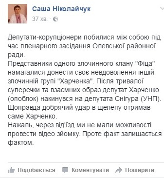 "Депутати-корупціонери побилися між собою під час пленарного засідання Олевської районної ради. Представники одного злочинного клану "Фіца" намагалися донести своє невдоволення іншій злочинній групі "Харченка". Після тривалої суперечки та взаємних образ депутат Харченко (опоблок) накинувся на депутата Снігура (УНП). Щоправда добрячий удар в щелепу отримав саме Харченко.