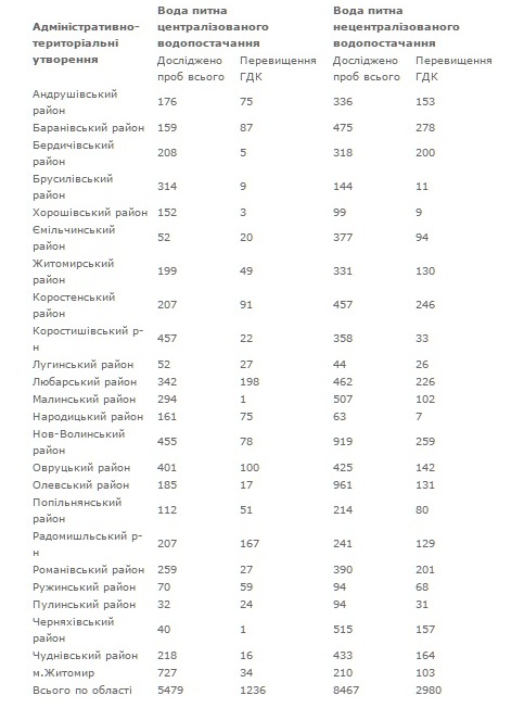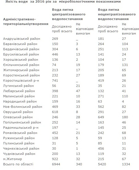 Не є виключенням і Житомирська область. Фахівцями обласного лабораторного центру протягом 2016 року здійснено значний обсяг лабораторних досліджень якості питної води в усіх районах області. Наглядно ознайомитись з даними щодо моніторингу якості води можна в доданих таблицях.