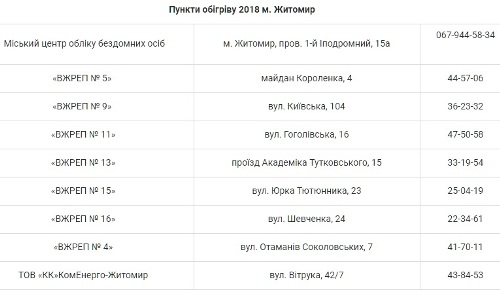 На території міста Житомира облаштовані пункти обігріву для населення, аби попередити випадки переохолодження людей та надати допомогу в період низьких температур та складних погодних умов.