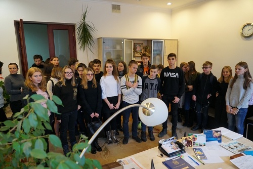 Разом зі своїм вчителем історії Михайлом Сліпченком школярі пройшлись коридорами будівлі на майдані ім. С.П. Корольова,1, оглянули кабінети працівників обласної ради, зокрема завітали до кабінету голови обласної ради Володимира Ширми. А в сесійній залі учні провели своє власне невеличке сесійне засідання.