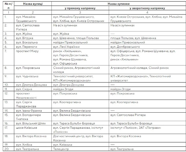Де зупинятимуться приміські автобусні маршрути у Житомирі після введення цих змін — нижче у таблиці: