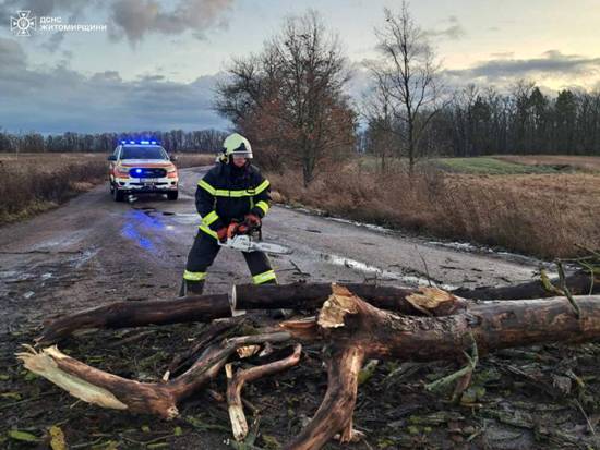 Також упродовж доби подібні аварійні роботи проводилися бійцями ДСНС в с. Дубище Житомирського району, в с. Хутір-Мокляки Звягельського району, а також в селах Камінь та Васьковичі Коростенського району. Там загалом було прибрано з проїжджих частин доріг ще п’ять повалених негодою дерев.