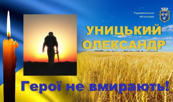 Радомишльська міська рада з сумом повідомляє, що в районі н.п. Вовчанськ Чугуївського району Харківської області загинув Захисник України, наш земляк, Олександр Леонідович Уницький, 1983 року народження.