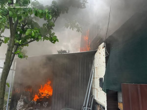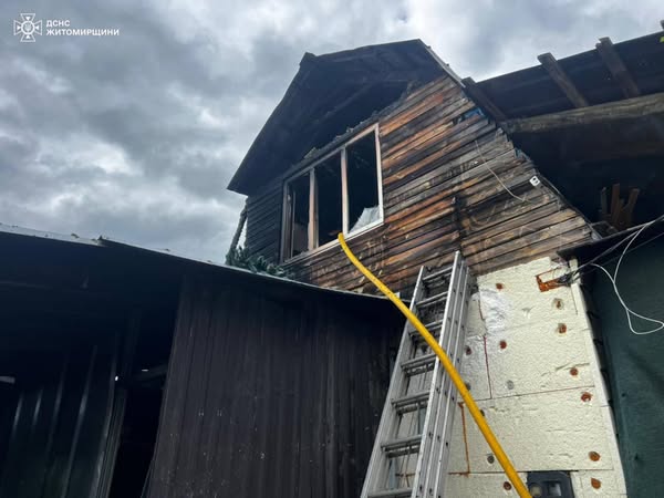 9 травня о 13:56 до Служби порятунку «101» надійшло повідомлення про пожежу в господарчій будівлі, яка поширилась на житловий будинок у Звягелі. По прибуттю бійців ДСНС було вогнем охоплено господарчу споруду та мансарду, впритул розташованого житлового будинку. Ускладнювало процес гасіння те, що будинок був критий жестю. Для підвозу води було залучено ще одне відділення вогнеборців.