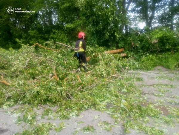 Поблизу села Мирне Бердичівського району дерево впало на проїжджу частину, заблокувавши рух в одному напрямку. За допомогою бензопили бійці ДСНС розрізали дерево та прибрали його залишки на узбіччя.
