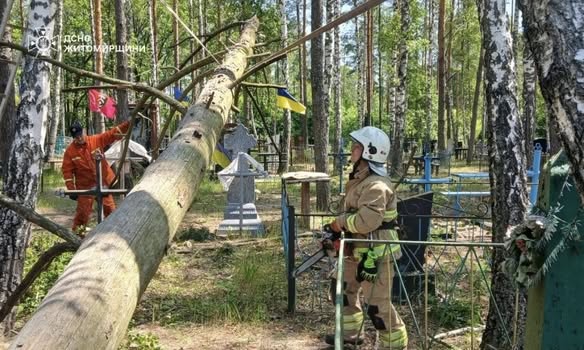 У селищі Діброва Коростенського району рятувальники оперативно прибрали два дерева, які надломилися й нависали над могилами на місцевому кладовищі. Через сильний вітер гілля могло в будь-який момент впасти просто на памʼятники.
