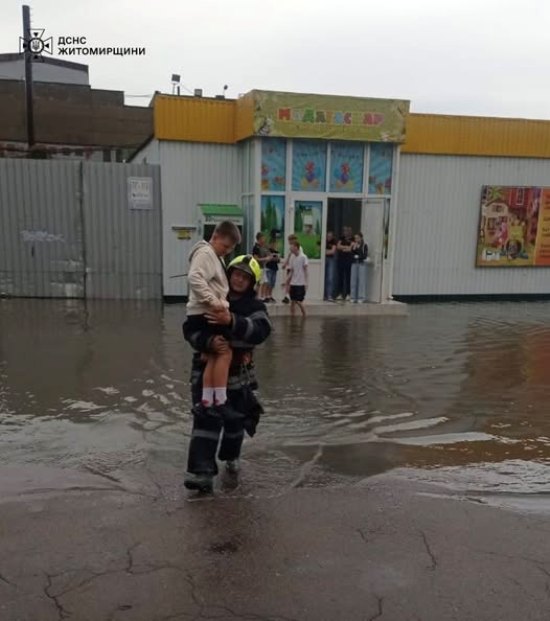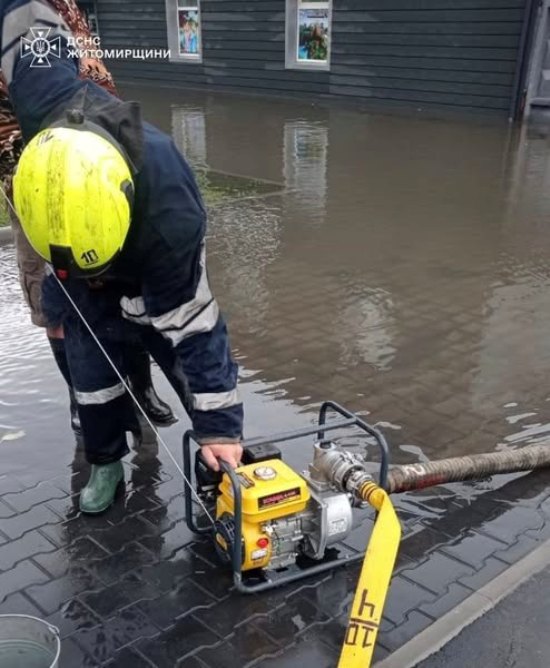Окрема увага — відкачці води з підтоплених територій. У приватних домоволодіннях рятувальники відкачали вже понад 312 куб. м води. Роботи тривають — наразі наші хлопці відкачують воду поблизу одного з магазинів у Звягелі.