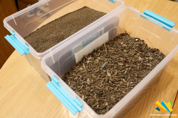 Євгеній Барах, керівник сміттєпереробного заводу, демонструє контейнери з технічним ґрунтом двох видів. Раніше це було сміття. Тепер — корисний ресурс. Один із них може бути використаний на прошарування на полігоні та рекультивацію.