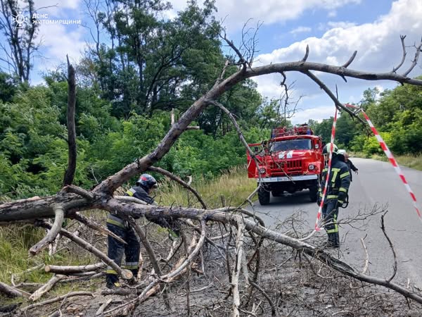 За добу рятувальники двічі залучалися до прибирання повалених негодою дерев. Зокрема, в Житомирі на дах веранди приватної оселі впало дерево. Бійці ДСНС розрізали його за допомогою бензопили.