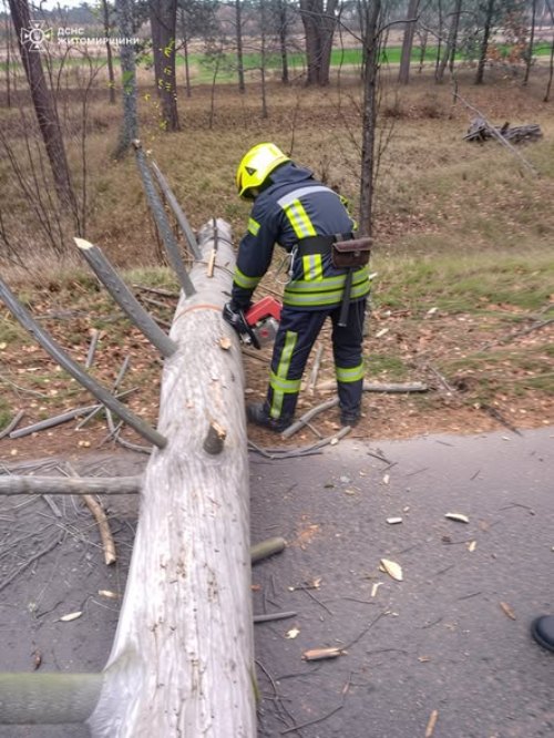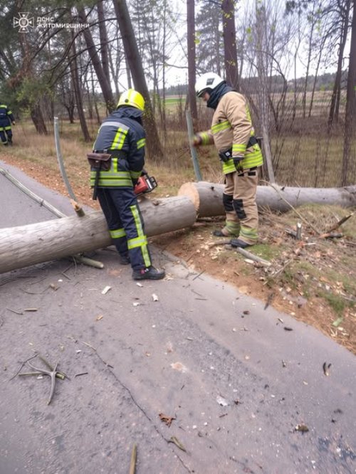 Учора через вітряну погоду рятувальники двічі виїжджали на прибирання дерев, що впали на дороги в селищі Лугини Коростенського району та селі Кропивня Житомирського району.