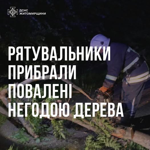 За добу рятувальники двічі залучалися до прибирання повалених поривами вітру дерев. Зокрема, в с. Межирічка Житомирського району впало дерево та перекрило рух в обидві сторони. Бійці ДСНС розрізали його за допомогою бензопили.