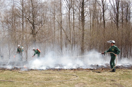 До Городницького лісгоспу з’їхалися представники всіх підвідомчих підприємств обласного управління лісового та мисливського господарства та рятувальники, щоб відпрацювати навички гасіння лісових пожеж в умовах, близьких до реальних.