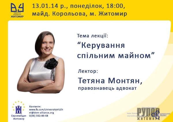 Сьогодні, 13 січня відома в Україні правозахисниця та громадський активіст Тетяна Монтян читатиме житомирянам лекцію «Керування спільним майном». Захід відбудеться в рамках проекту Відкритий Університет Житомира (ВУЖ) о 18.00 на майдані Корольова.