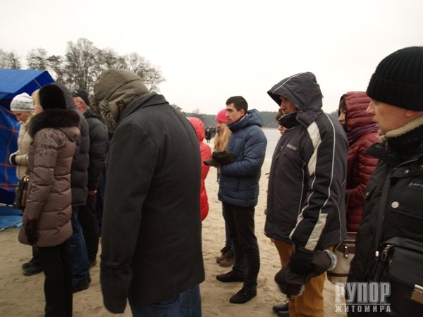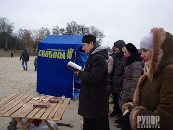 Після святкової Служби Божої, яку відправив отець Ілля Української православної церкви Київського Патріярхату, та традиційного освячення води, свободівці разом із иншими загартованими житомирянами занурились у крижану "святу воду" річки Тетерев.