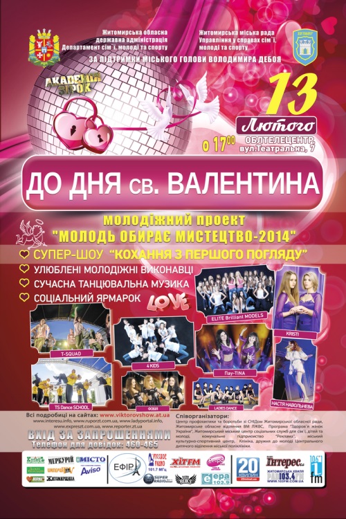 Залишається додати, що створенню молодіжного мистецького свята "ДЕНЬ СВЯТОГО ВАЛЕНТИНА-2014" сприяють: генеральний медіа-партнер – телерадіокомпанія "ЕФІР" та її радіостанції "Русское радио", "Ретро FM", "Ера FM", "Хіт FM", "Радіо РОКС", ексклюзивний медіа-партнер – газета "20 хвилин", головний медіа-партнер – газета "Ваші ІНТЕРЕСи", головний радіо-партнер – радіо "Житомирська хвиля". Інформаційну підтримку здійснюють: радіостанціїя "Z-радіо", КП "Реклама", РА "Прайм", газети "Авізо", "Місто", "Пульс-норма", "Імперія ТВ", "Меркурій", "Житомирщина", сайт Житомирської міської ради, сайти: www.interesu.info, www.ruporzt.com.ua, www.expreszt.com.ua, www.ladyportal.info