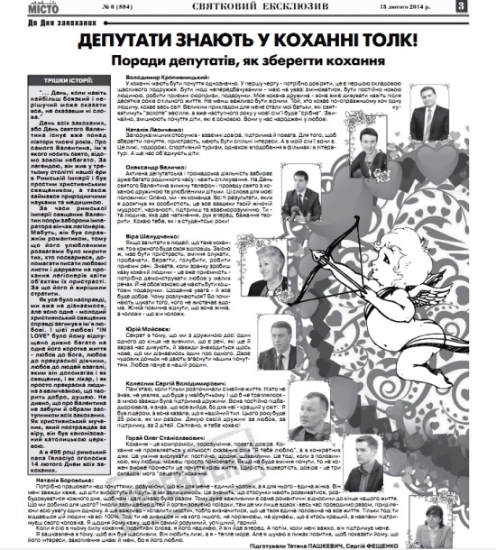 Депутати знають в коханні толк! Ексклюзив – поради від депутатів Житомирської міської ради як зберегти кохання – опубліковано у свіжому номері газети «Місто» від 13.02.2014 р.